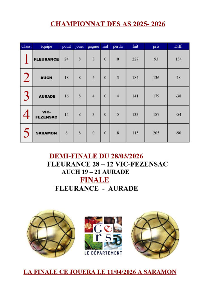 • RESULTATS des finales du championnat départemental simple de SAMATAN des 2 et 3 avril 2022