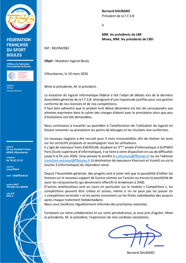 LOGICIEL BOULY EN COURS DE RENOVATION – COURRIER DE LA FFSB (h.s)