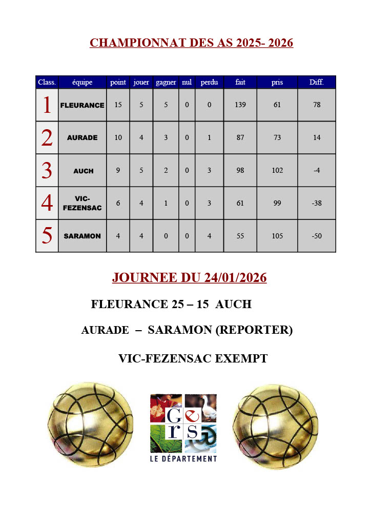 Non classé RESULTATS DES AS JOURNEE DU 24.01.2026 Publié 25 janvier 2026 Tableau préparé par Eric JACQUES.