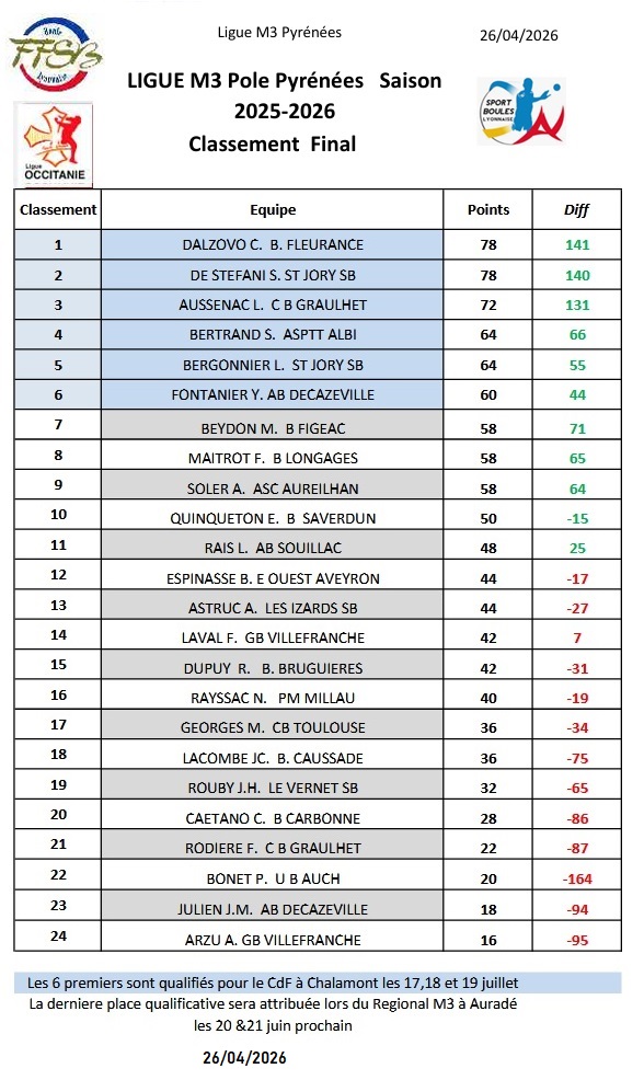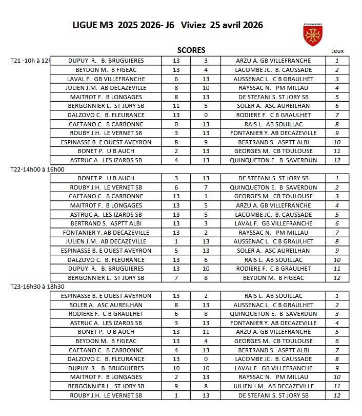 Résultats Ligue M3 -J6 au Viviez 12 du 26 Avril 2026